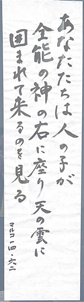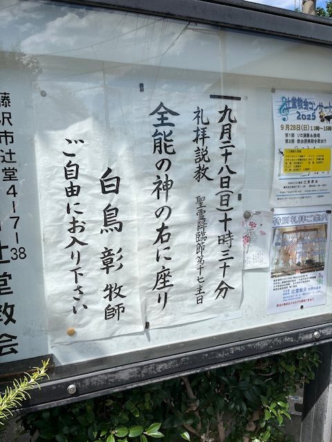 2025-09-21 / 最終更新日時 : 2025-09-21 伴純子 礼拝案内 9月28日礼拝のご案内 聖霊降臨節 第17主日 午前10時30分説 教:『 全能の神の右に座り 』説 教 者: 白鳥 彰 牧師 聖 書: マルコによる福音書14章53~65節講壇聖句:あなたたちは、人の子が全能の神の右に座り、天の雲に囲まれて来るのを見る。」(マルコによる福音書14章62節bc)讃美歌: 90, Ⅱ編-196, 262交読文: 6(詩23篇) 9月21日講壇生花 9月28日講壇聖句 教会庭のキウイフルーツ 9月28日礼拝案内