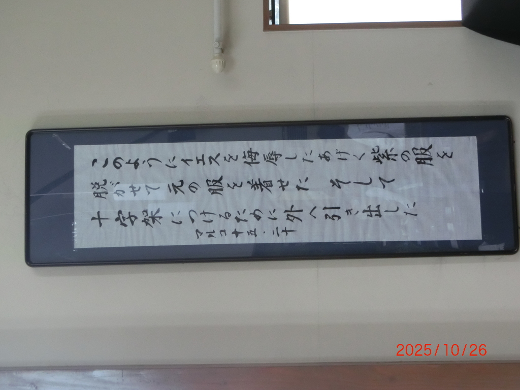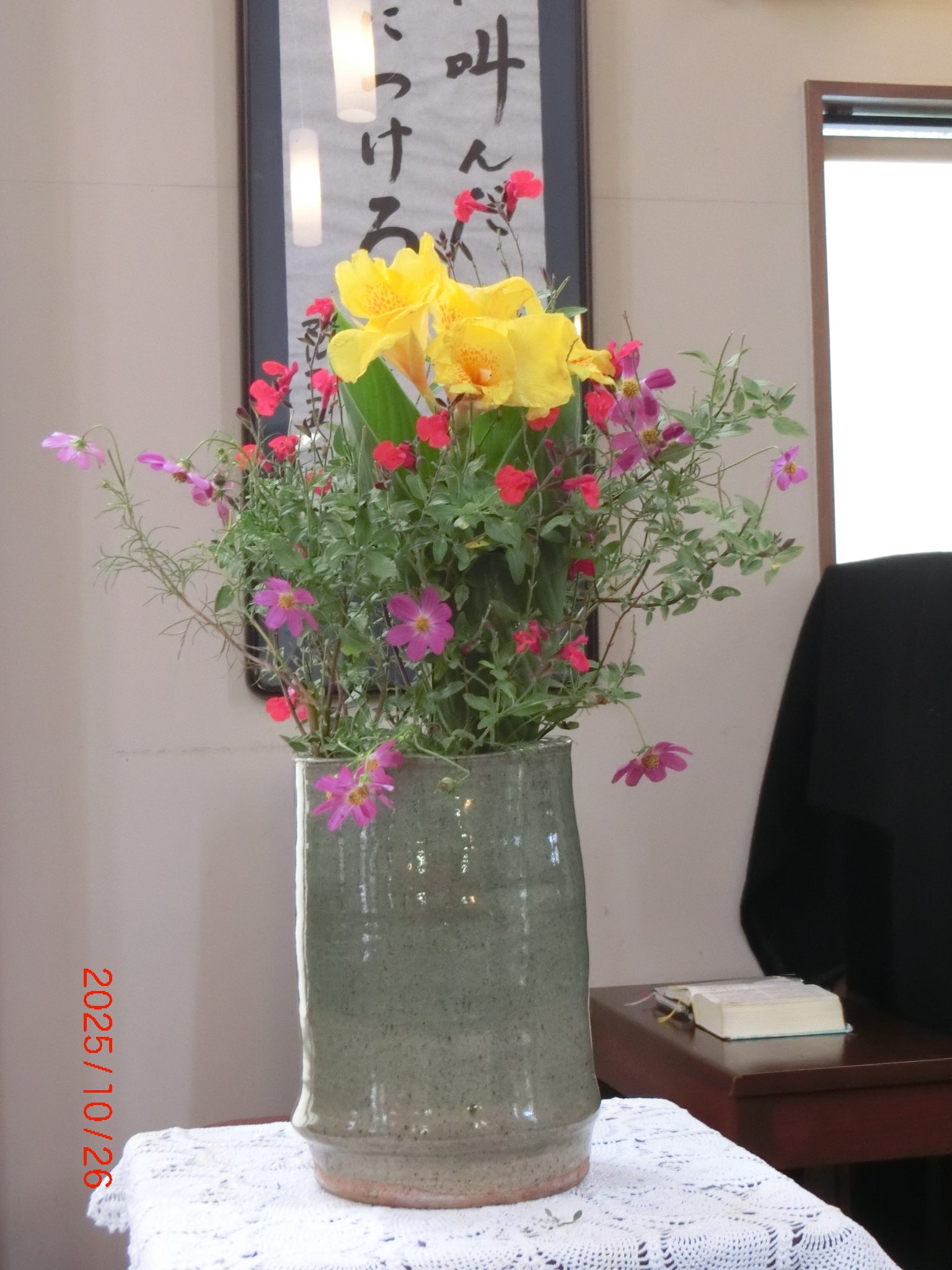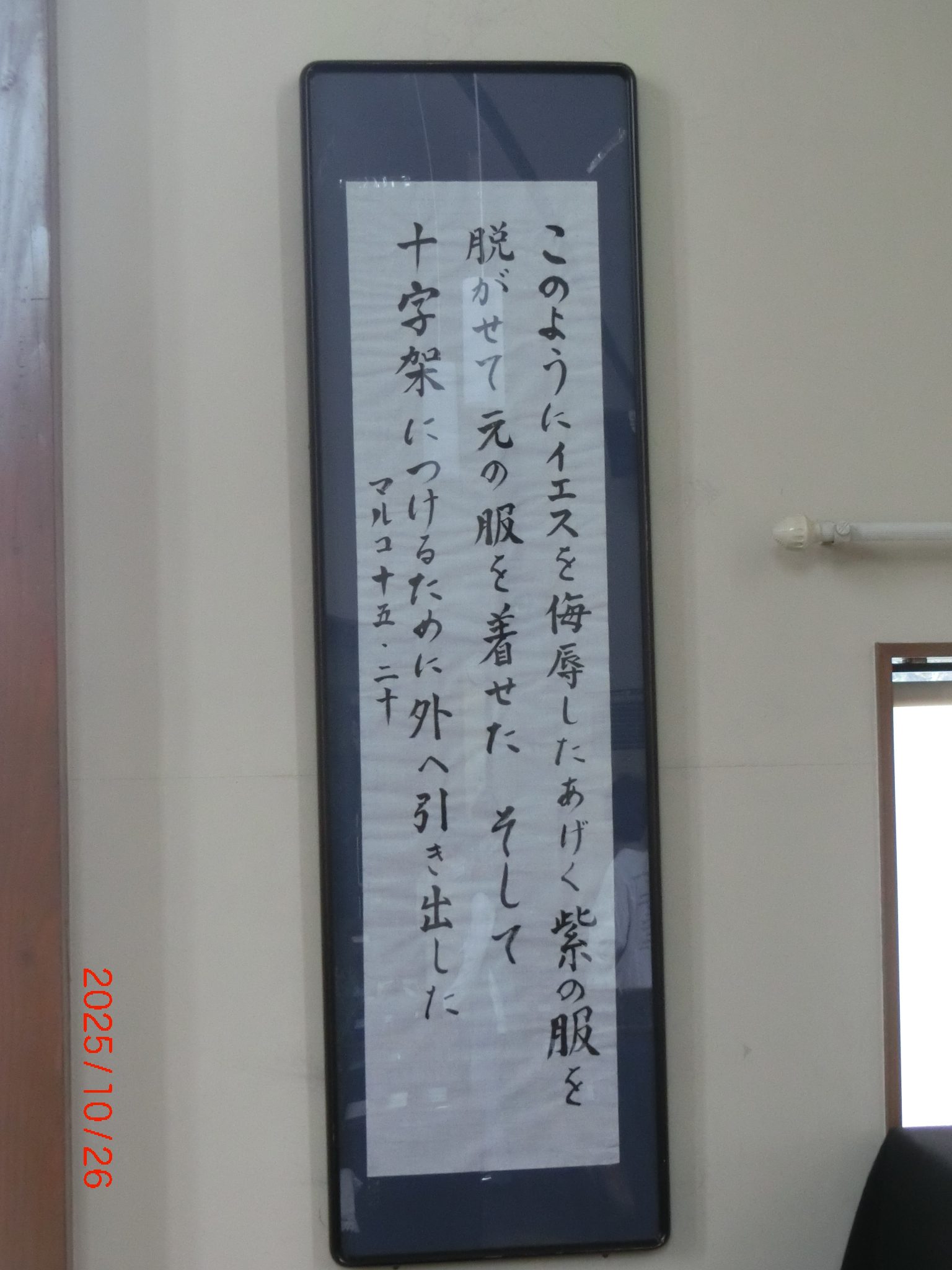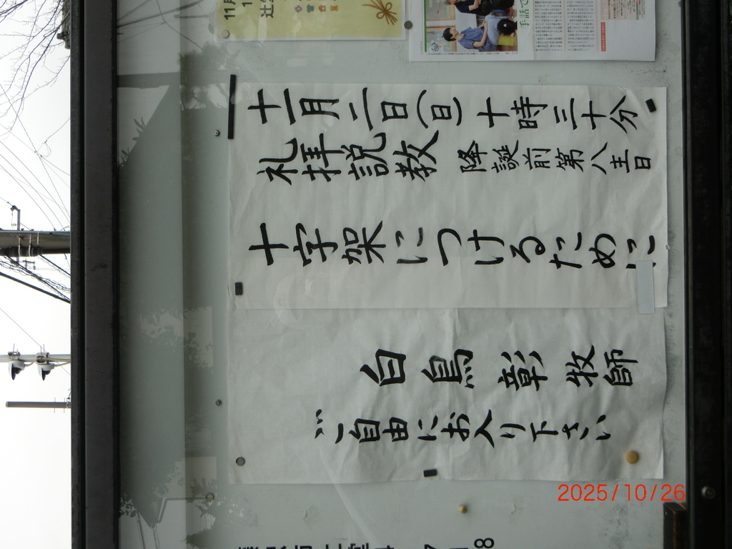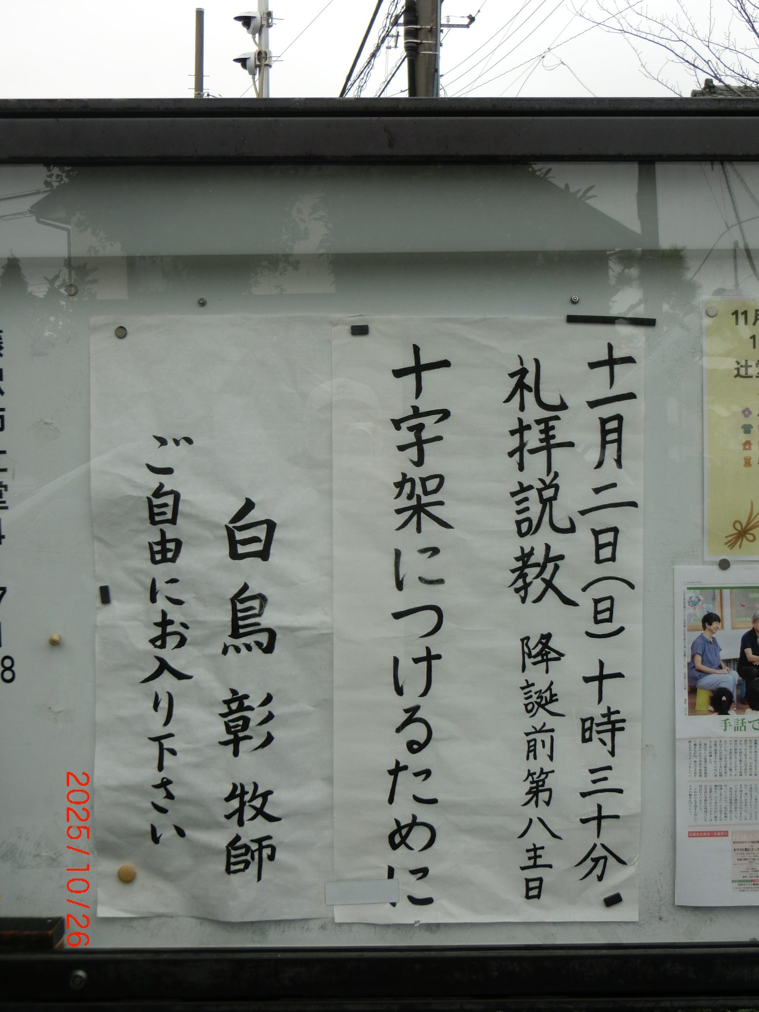 2025-10-27 / 最終更新日時 : 2025-10-27 岩本日出生 礼拝案内 11月2日礼拝のご案内 降誕前 第8主日 午前10時30分説 教:『 十字架につけるために 』説 教 者: 白鳥 彰 牧師 聖 書: マルコによる福音書15章16~20節講壇聖句:このようにイエスを侮辱したあげく、紫の服を脱がせて元の服を着せた。そして、十字架につけるために外へ引き出した。(マルコによる福音書15章20節)讃美歌: 39, Ⅱ編-196, 239交読文: 6(詩23篇) 礼拝案内11月2日 講壇生花10月26日 講壇聖句11月2日 再生二毛作(教会庭にて)