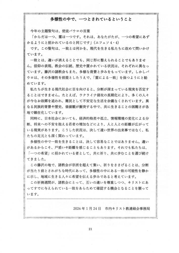 2026-01-31 / 最終更新日時 : 2026-02-01 m-ito お知らせ 2026年キリスト者一致のための合同祈祷会 2026年1月24日に、藤沢市内キリスト教連絡会主催の合同祈祷会が開かれました。 参加状況は、13教会・団体、約60名の参加、辻堂教会からは7名の参加でいた。 会場となった藤沢北教会の写真と礼拝室の様子を写真で紹介します。 祈祷会の式次第は次のとおりです。 祈祷会の趣旨は以下の通りです。 藤沢市内キリスト教連連絡会のときに、必ず歌う讃美歌があります。最後の部分は輪唱でとてもいい歌です。これは特別に作られた曲で、教団藤沢教会の人が作ったものです。 心ひとつに